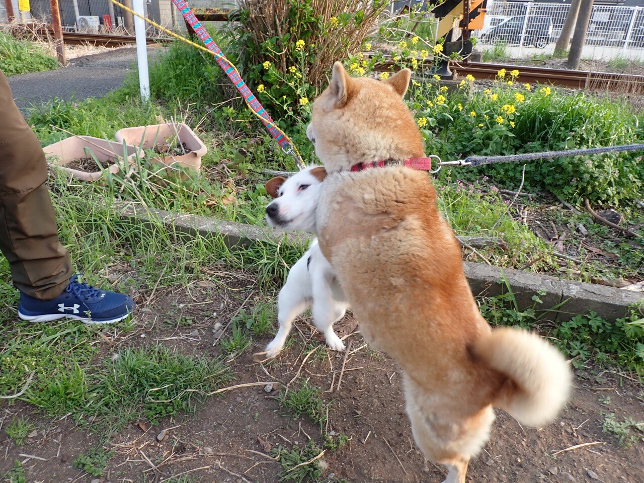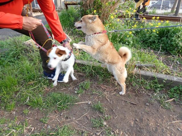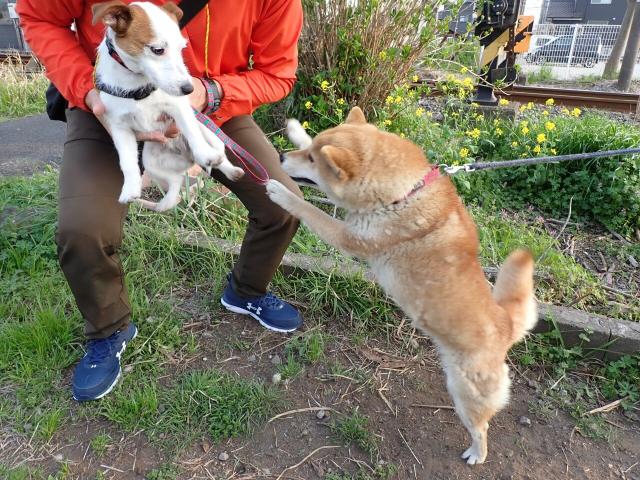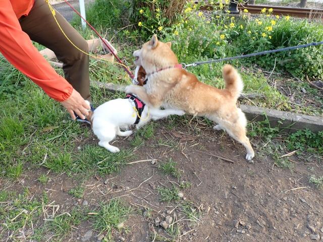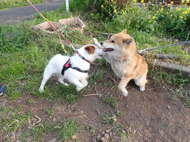 Maron can be over enthusiastic and scares a lot of other dogs off, or makes them mad enough to bite her.. Only the huge Akita dogs are really good with her, being 5 or 6 times as big.. But this Jack Russel Terrier was a good sport about being overwhelmed..