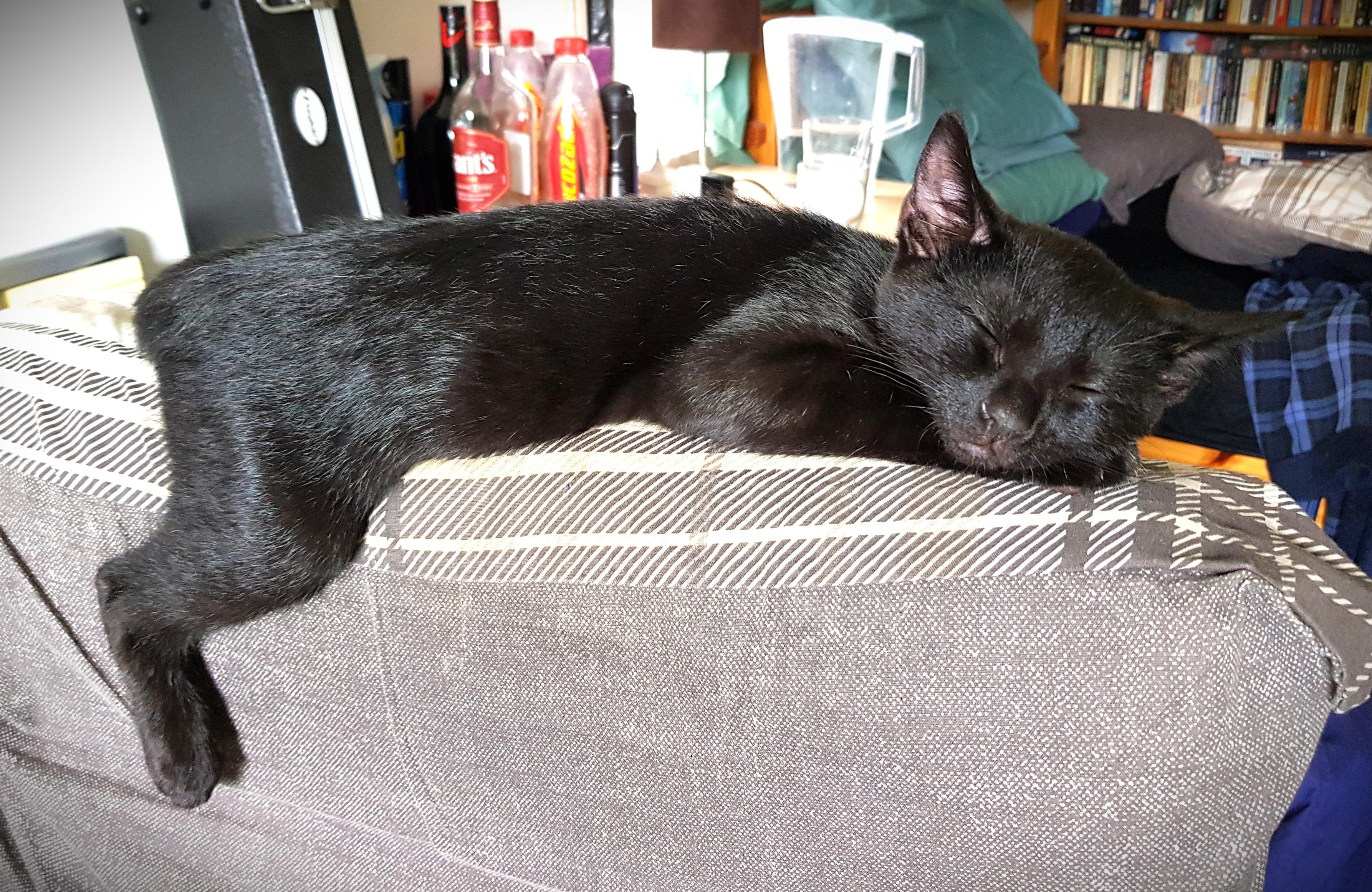 Norbert - sleeping balanced on the headrest of a chair