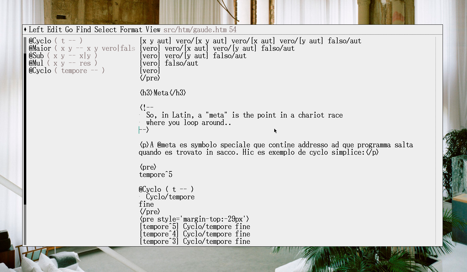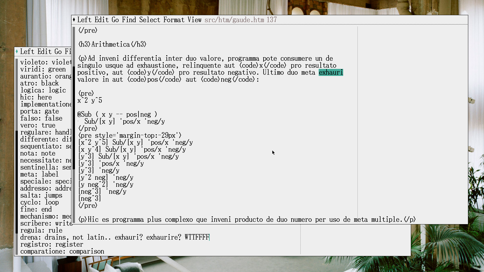 As a sort of homage to his work, and considering he was looking for the substrate of mathematical shapes with his ideas, and I've been haphazardly following his footsteps lately with this notation project called Rejoice(REJOIRE!! no I'm kidding, it'll keep the name rejoice in LSF), I've started to write a version of the documentation for this notation in Latin Sine Flexione.