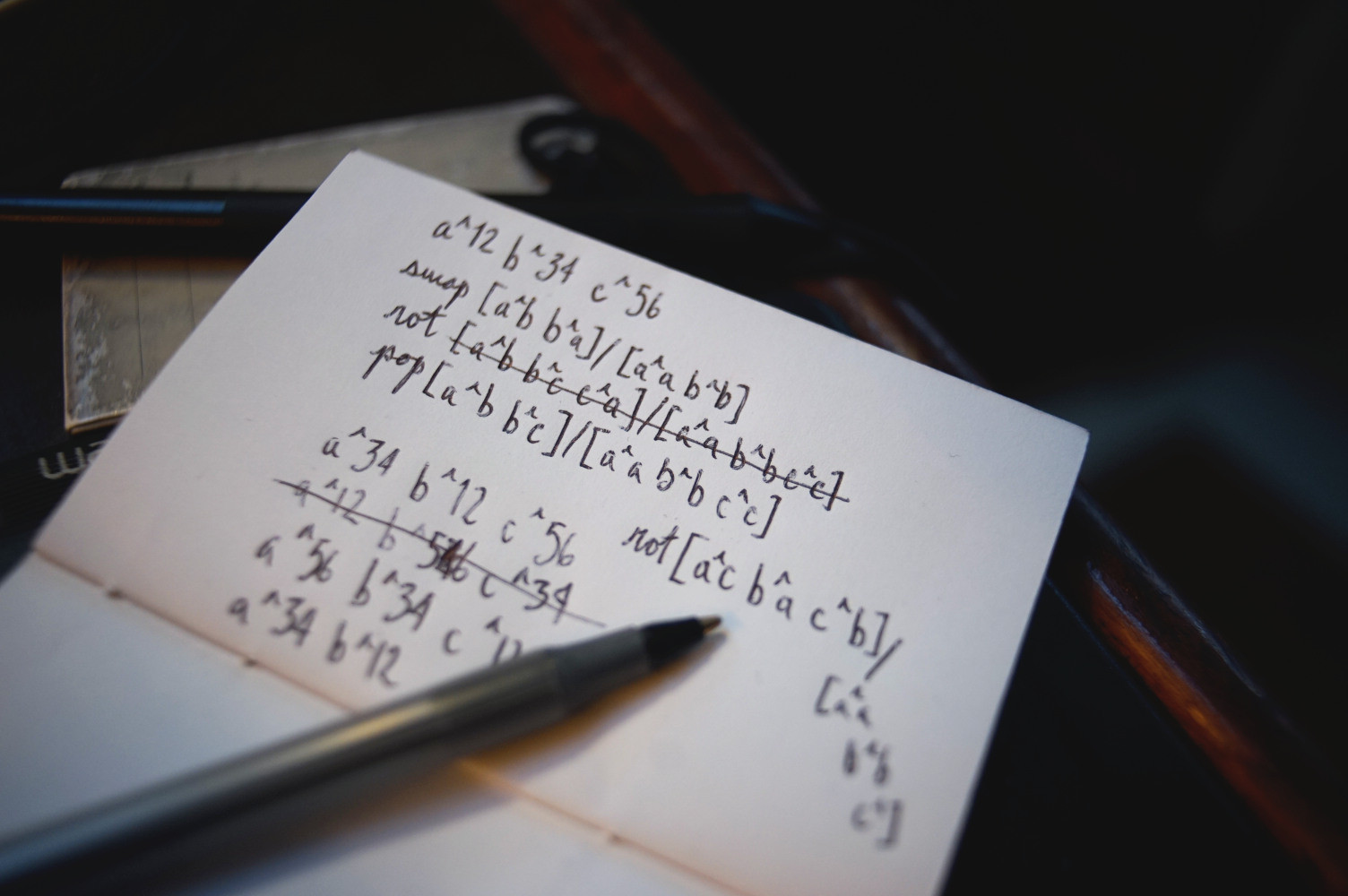 Stack operator scribbles, trying to tame the chaos of multisets. Each stack machine primitive is the application of a single fraction.