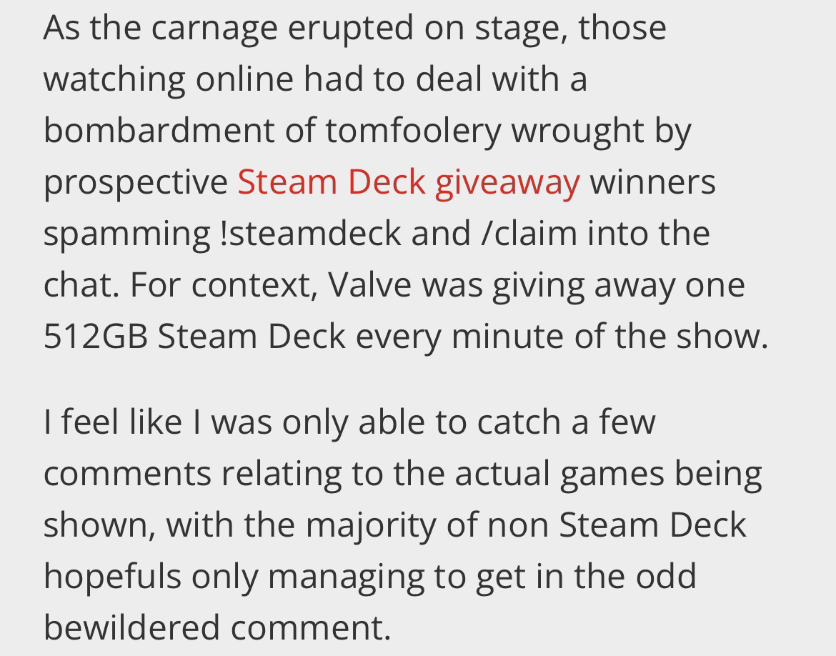 PCGamer wrote a silly article about the Steam Deck giveaway, because people kept spamming things like โ€œ/claimโ€ in the chat.