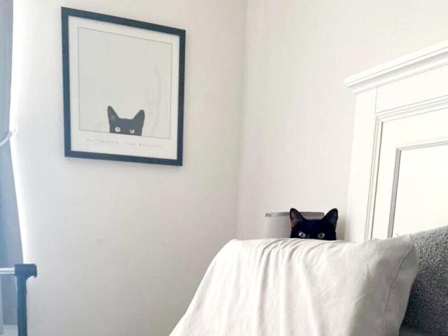 He tore a hole in the curtain so he could climb onto the windowsill, bask in the sun, and mock me.