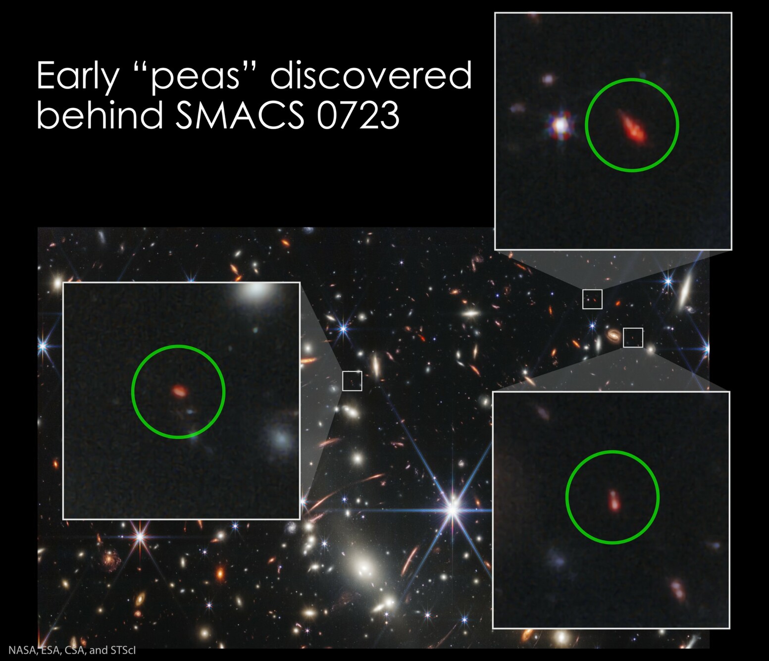 In @NASAWebb's very fist image, scientists have now identified three of the earliest galaxies, and they resemble a rare type in our cosmic neighborhood: Green pea galaxies. go.nasa.gov/3GPdQB2