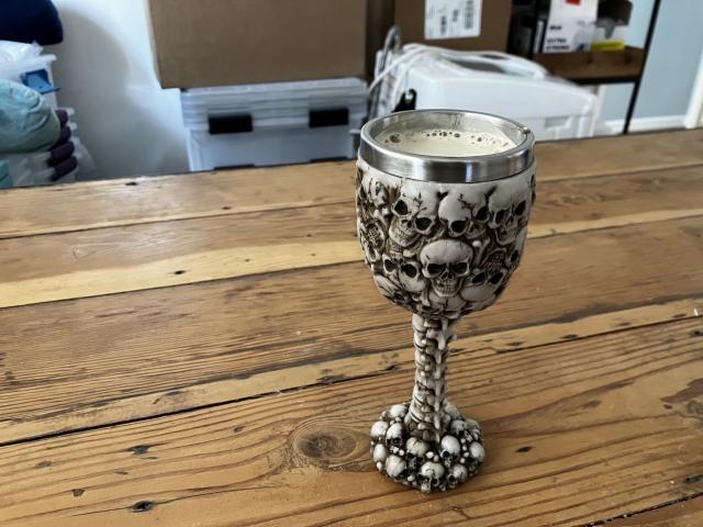 My “be gay do crime” coffee broke on the move to California so I have replaced it with this goblet made from the skulls of my enemies.