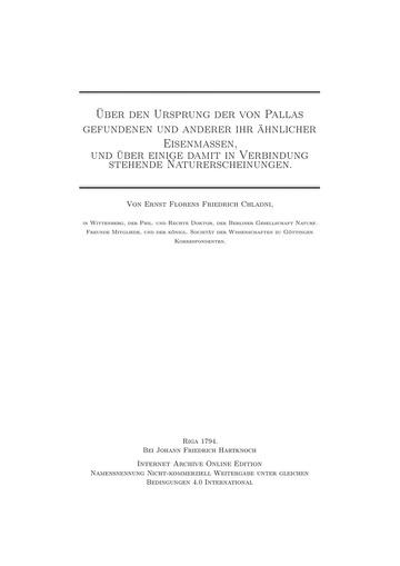 Über den Ursprung der von Pallas gefundenen und anderer ihr ähnlicher Eisenmassen, und über einige damit in Verbindung stehende Naturerscheinungen : Ernst Florens Friedrich Chladni : Free Download, Borrow, and Streaming : Internet Archive
