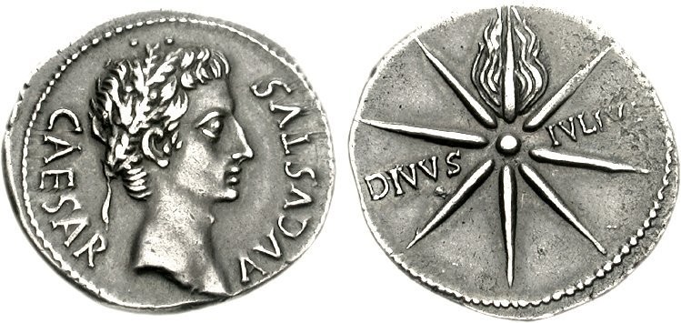 Augustus wearing the corona civica. Reverse side: "Depicts the comet which made a continuous daylight appearance during July 44 BCE, and was associated with the deification of Julius Caesar." - Classical Numismatic Group, Inc. cngcoins.com, CC BY-SA 2.5, via Wikimedia Commons.