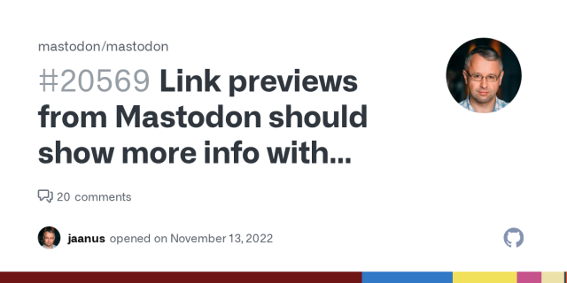 Steps to reproduce the problem Share a link to a post on Mastodon in some system which uses Apple’s LPLinkView to render link previews Observe the preview that gets rendered Expected behaviour The ...GitHub