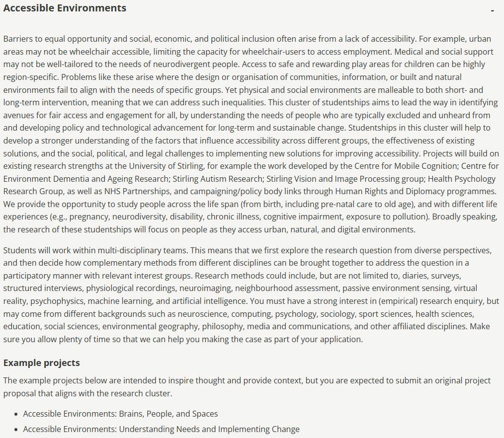 I'm involved in the Accessible Environments cluster. The aim of studentships in this cluster is to identify avenues for fair access and engagement for all, by understanding the needs of people who are typically excluded and unheard from, and developing policy and technological advancement for change.