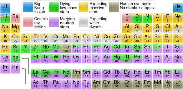 From Wikipedia contributor Cmglee and Astronomy Picture of the Day, a color-coded periodic table that displays which cosmic evenkottke.org