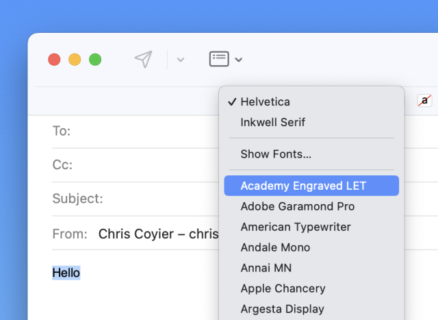I’d like to remove the typeface Academy Engraved LET please. chriscoyier.net/2023/02/13/id-…