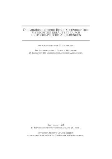 Die mikroskopische Beschaffenheit der Meteoriten erläutert durch photographische Abbildungen herausgegeben von G. Tschermak.Die Aufnahmen von J. Grimm in...Internet Archive