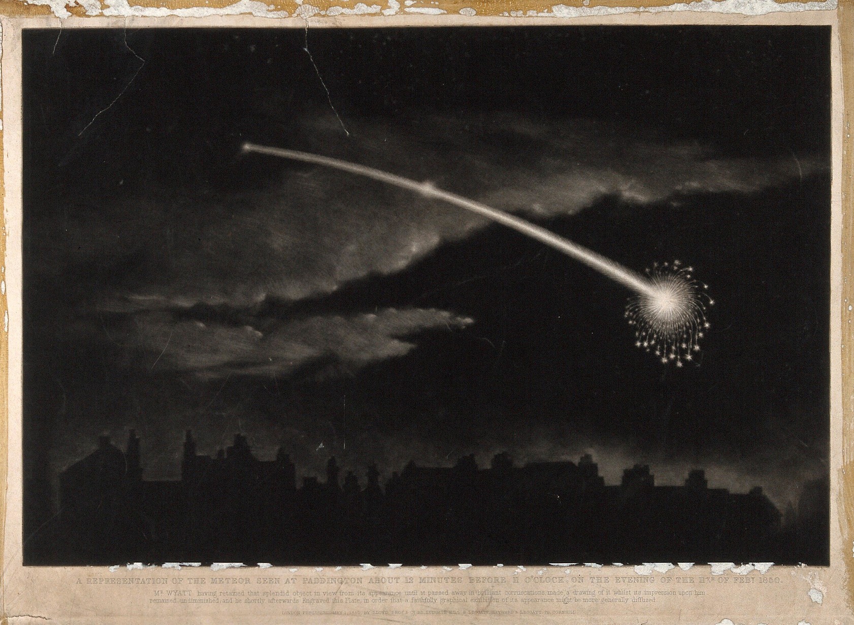 "A representation of the meteor seen at Paddington about 12 minutes before 11 o'clock, on the evening of the 11th of Feb. 1850. Mr. Wyatt ... made a drawing of it whilst its impression upon him remained undiminished, and he shorty afterwards engraved this plate, ..."