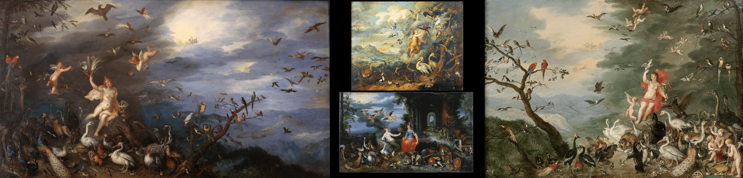 Four paintings with Urania by either Jan Brueghel the Elder or Jan Brueghel the Younger, made between 1611 and 1670.