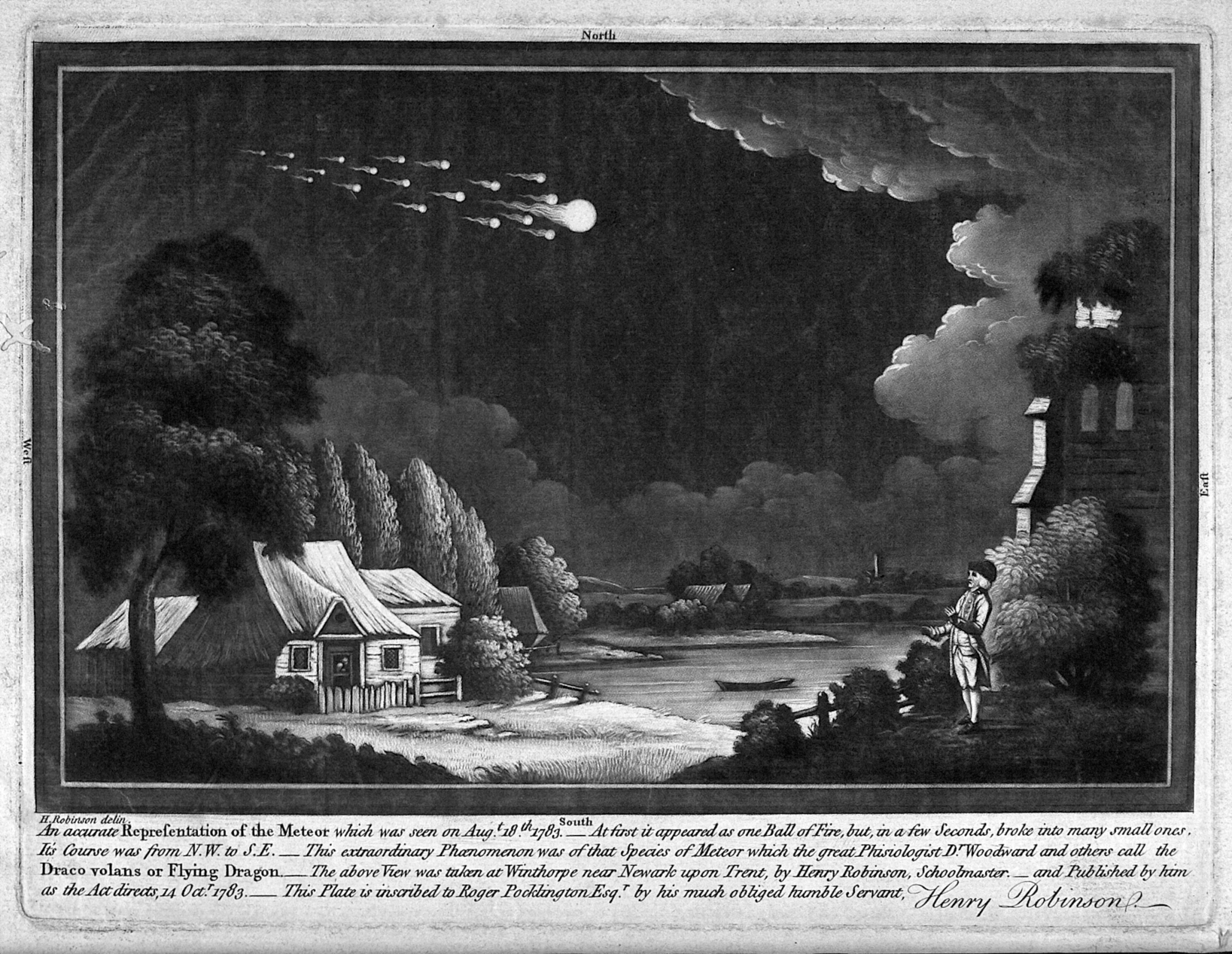 A single meteor becomes many smaller ones in the night sky. Seen on Aug. 18th, 1783.