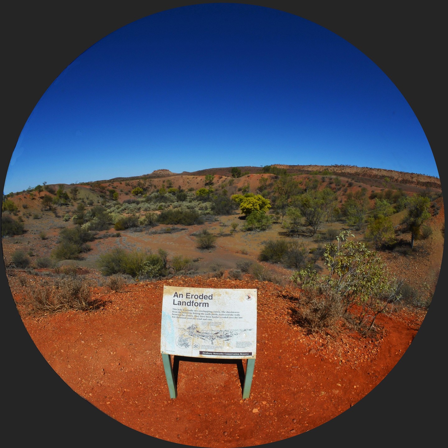 From sign at the Henbury Meteorite Conservation Reserve: "An Eroded Landform: This hole is actually two overlapping craters. The shockwaves from the meteorite hitting the earth partly destroyed the walls between the craters. They have been further eroded over the last few thousand years by wind and rain."