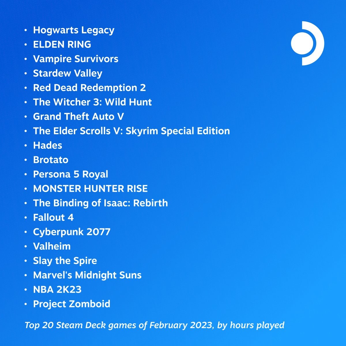 The year is just flying by - here's a quick look at the top 20 games of February on Steam Deck, sorted by playtime.