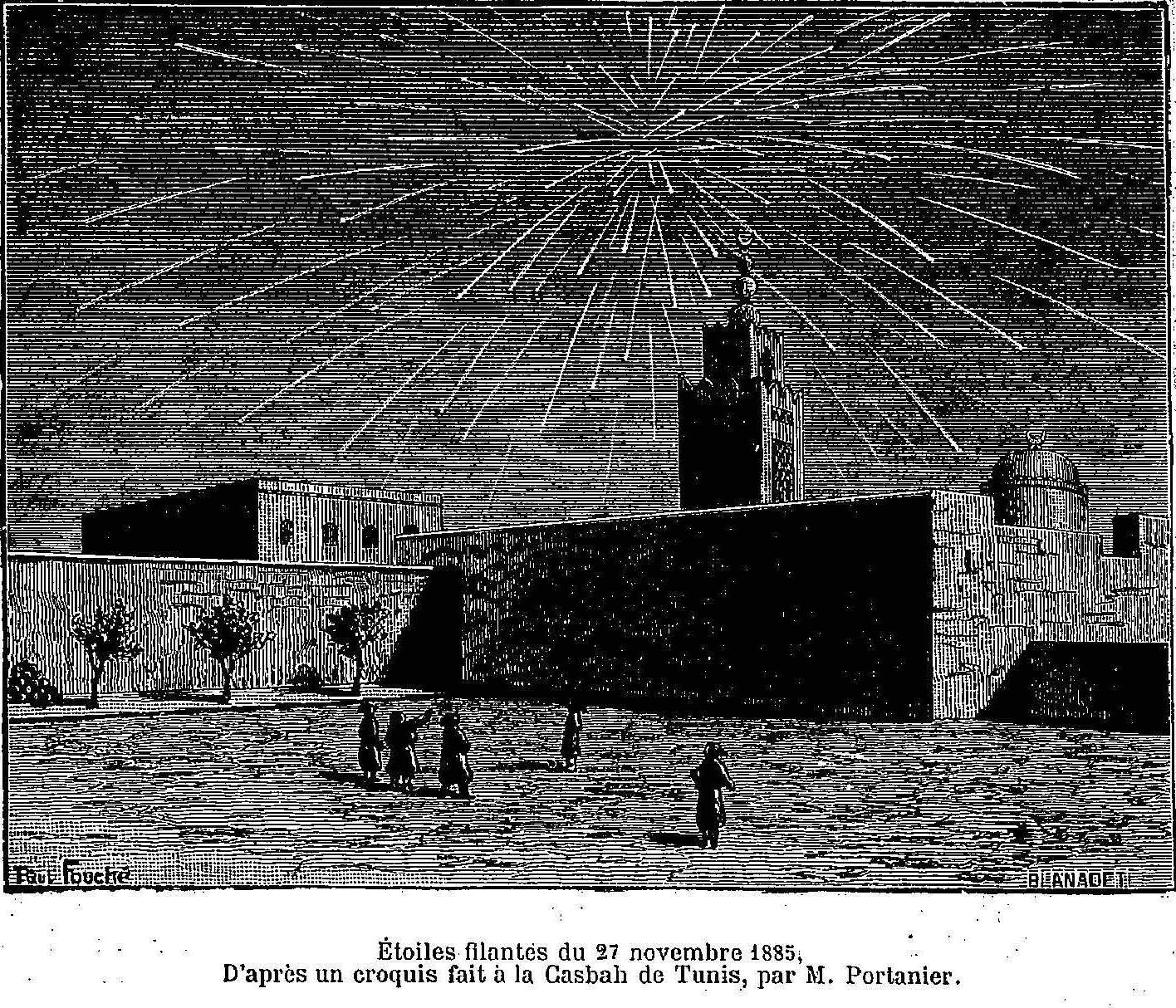 "Shooting stars of November 27, 1885, from a sketch made at the Kasbah of Tunis," by M. Portanier.