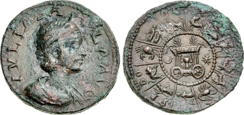 A carpentum or carruca carrying the Image of the Goddess Astarte within a zodiacal circle. (~219-220 CE)