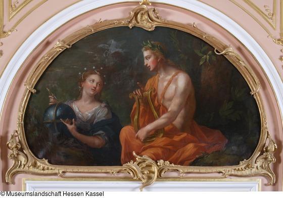 Künstler: Johann Heinrich d. Ä. Tischbein (1722 - 1789) - Eins von fünf Supraporten mit den Halbfiguren der neun Musen und des Apoll. Geschnitzte Rahmen in Umschreibung der Korbbogen- und Hufeisenformen der oberen Türumrahmung. Rahmen in flache...Museumslandschaft Hessen Kassel (MHK)