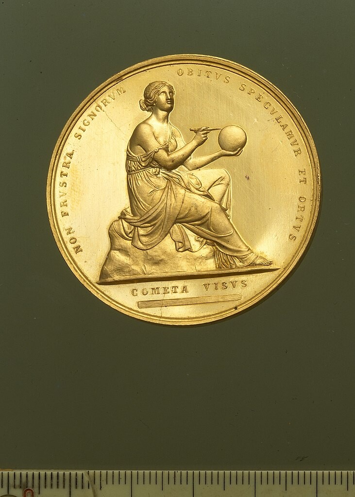 "It represents Urania sitting with a compass as well as a globe and carries the phrase: NON FRVSTRA SIGNORVM OBITVS SPECVLAMVR ET ORTVS (not in vain do we observe the decline and rise of the constellations) and the inscription COMETA VISVS (the comet observed) with a field for name inscription on the recipient. It was given to astronomers who found new comets, including the designation."