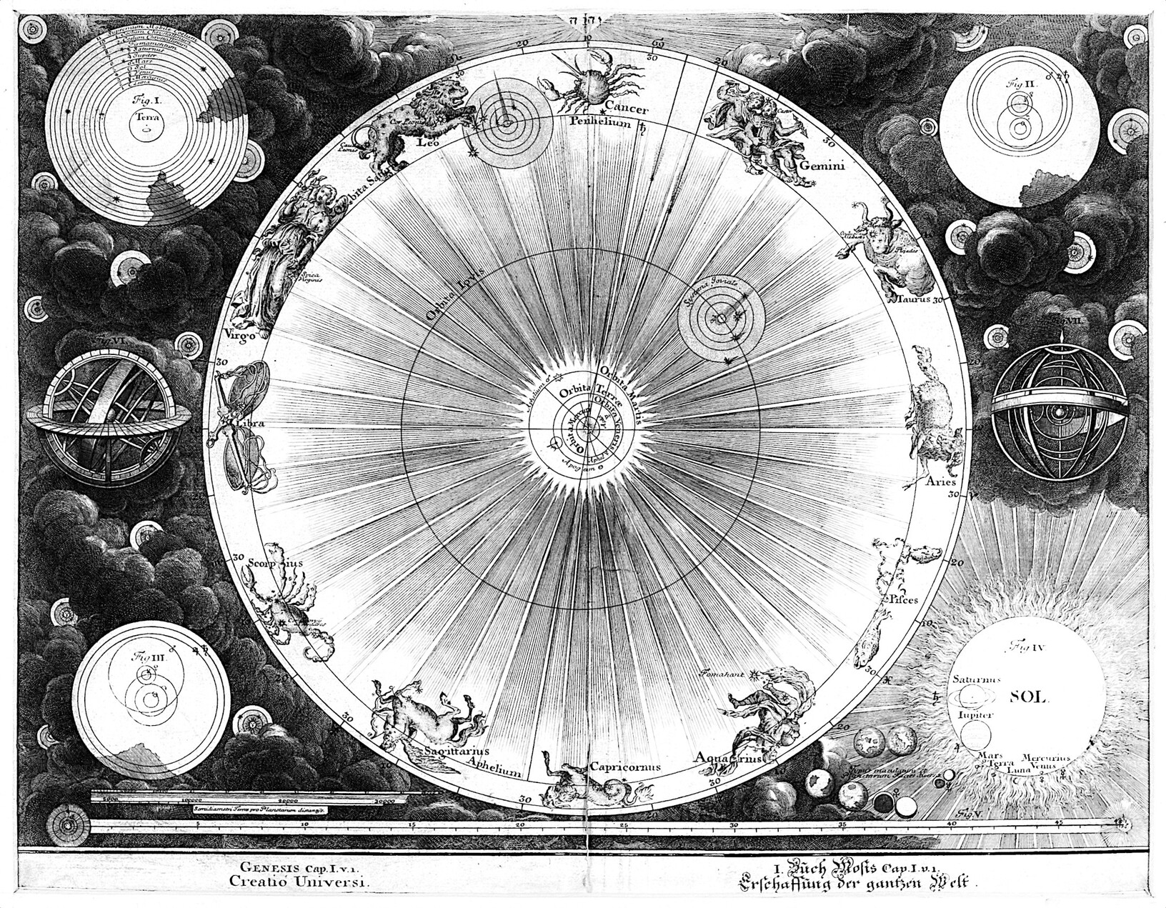 "A Cosmological Plan detailing Copernicus' astronomical Vision; surrounded by diagrams of the systems of Ptolemy and Tycho Brahe... among the billowing clouds, other solar systems can be seen... The scale at the bottom measures the distance between our solar system and Sirius..." by Johann Melchior Füssli (1732).