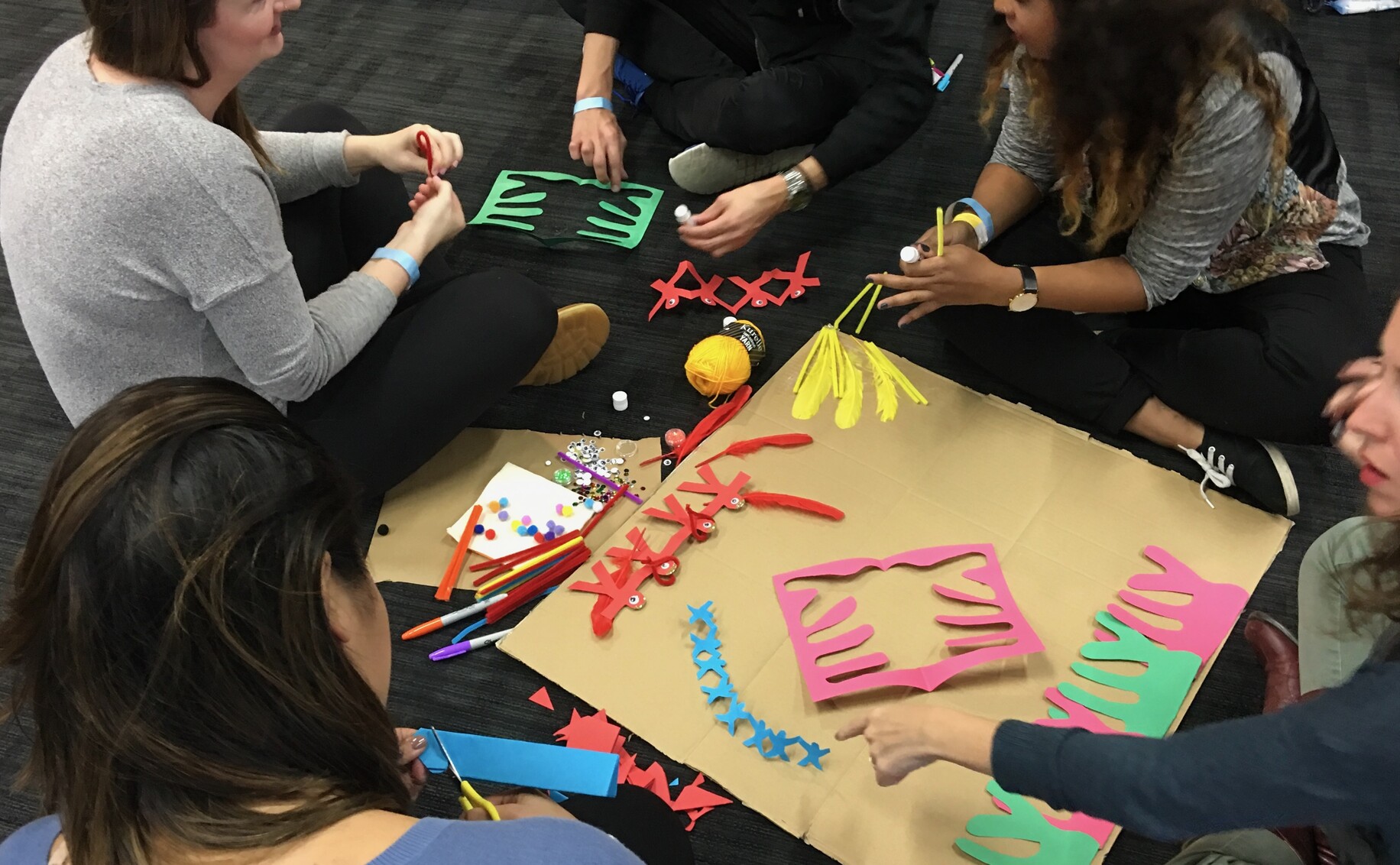 #alt4u 5 participants are sitting on the a dark-coloured indoor floor around a brown kraft paper square. They are working together to make something on that paper with craft materials (including coloured paper cutouts)