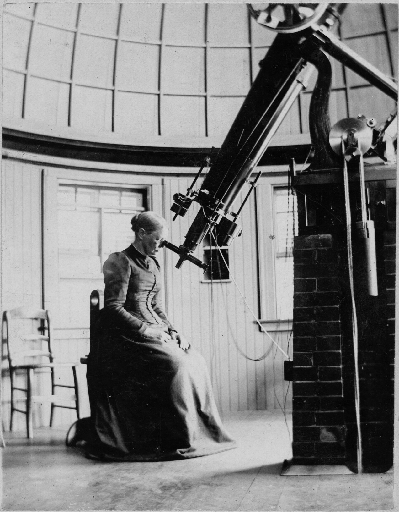 Photograph of Professor Elizabeth M. Bardwell, Mount Holyoke class of 1866, seated at telescope in Williston Observatory (1881).
