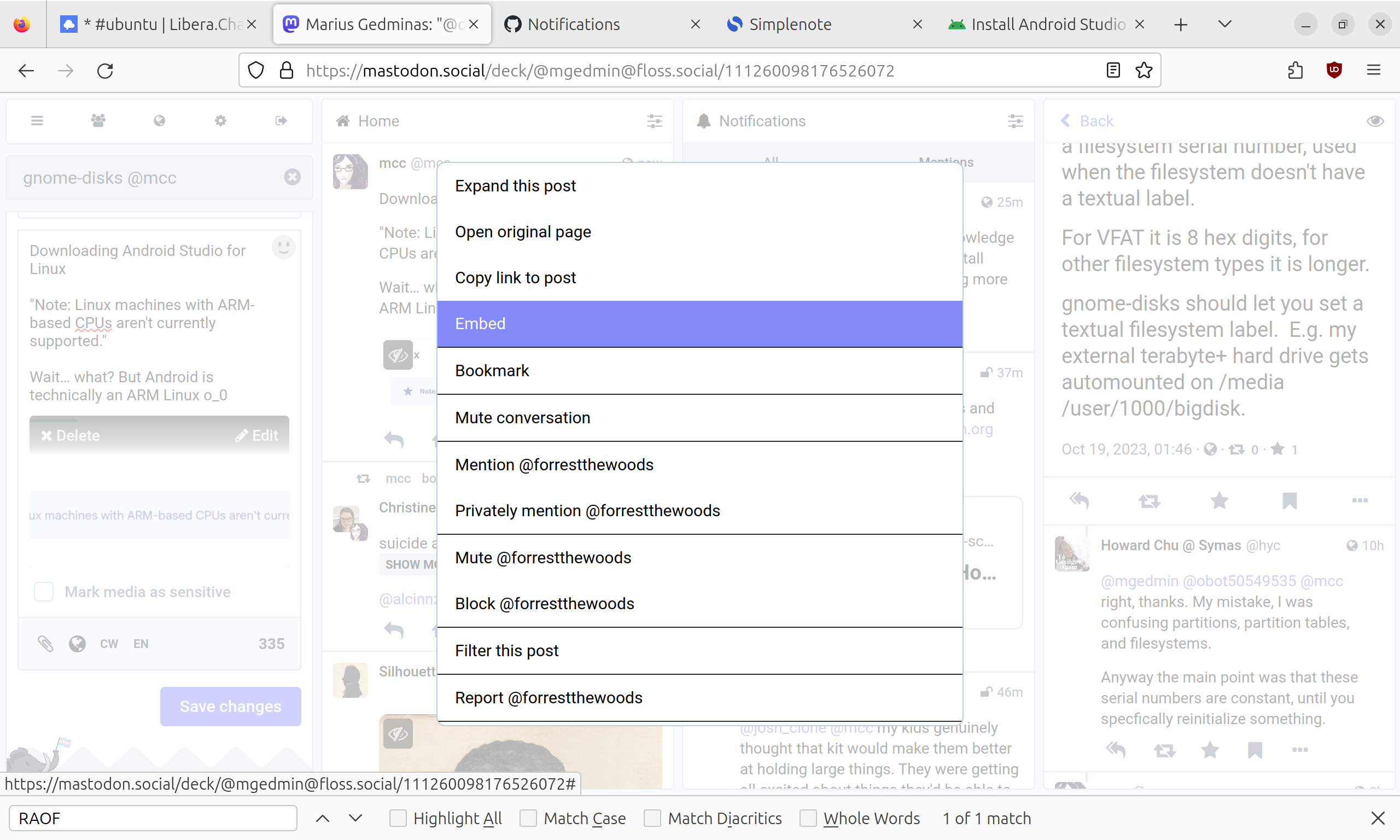 Oh, I… i really, *really* dislike the new-in-the-last-few-minutes change to the … menus in Mastodon Web where everything that isn't the menu gets grayed out. I maximize my browser windows! This is like literally a full screen flash! Do not penalize us by *flashing the entire screen* on a common operation like bringing up the menu! Also why is the menu so wide?
