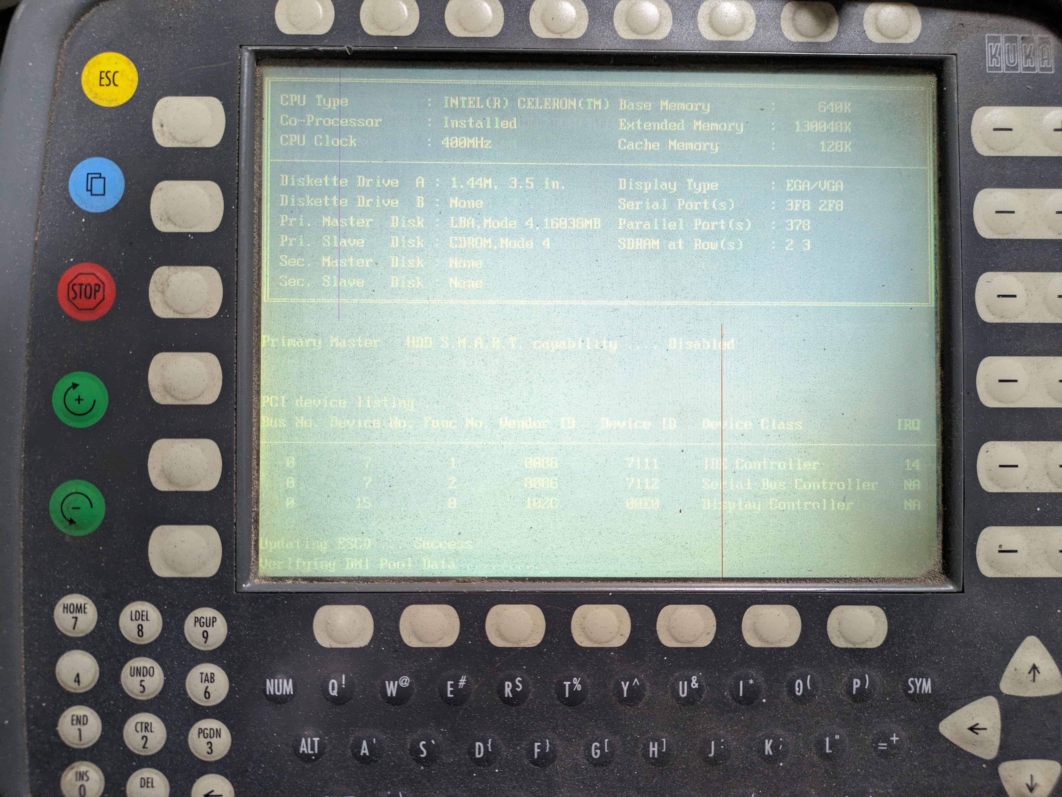 photo of the pendant screen showing bios post screen with a custom kuka boot logo. the screen looks like crap, it's a 1995 lcd. photo of the pendant screen, windows 95 booting.