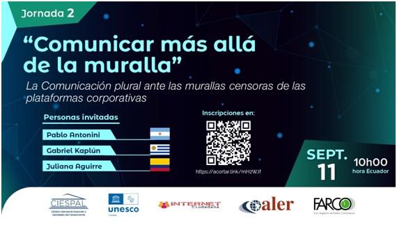 El segundo Encuentro lleva como título «La Comunicación plural ante las murallas censoras de las plataformas corporativas.» y tendrá lugar este Miércoles 11/9 (9 am Centroamérica/Mx; 10 am Per/Ecu/Col/Cu/Pa; 11 am Bo/RD/Ve/Chi/Py; 12 h Ar/Br/Uy).