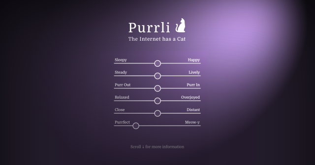 Not just a cat purr, but a cat purring next to you. Purrli recreates the sound and the presence of a cat, online. It's soothing, it's free, and it's purrfect!purrli.com