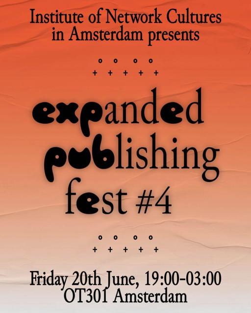 Expanded Publishing Fest #4Exploring Expanded Publishing20 June, 19:00-03:00 @OT301, Amsterdamtalks * performances * live coding * micro book fair * tactical television * club night- free entrnetworkcultures.org