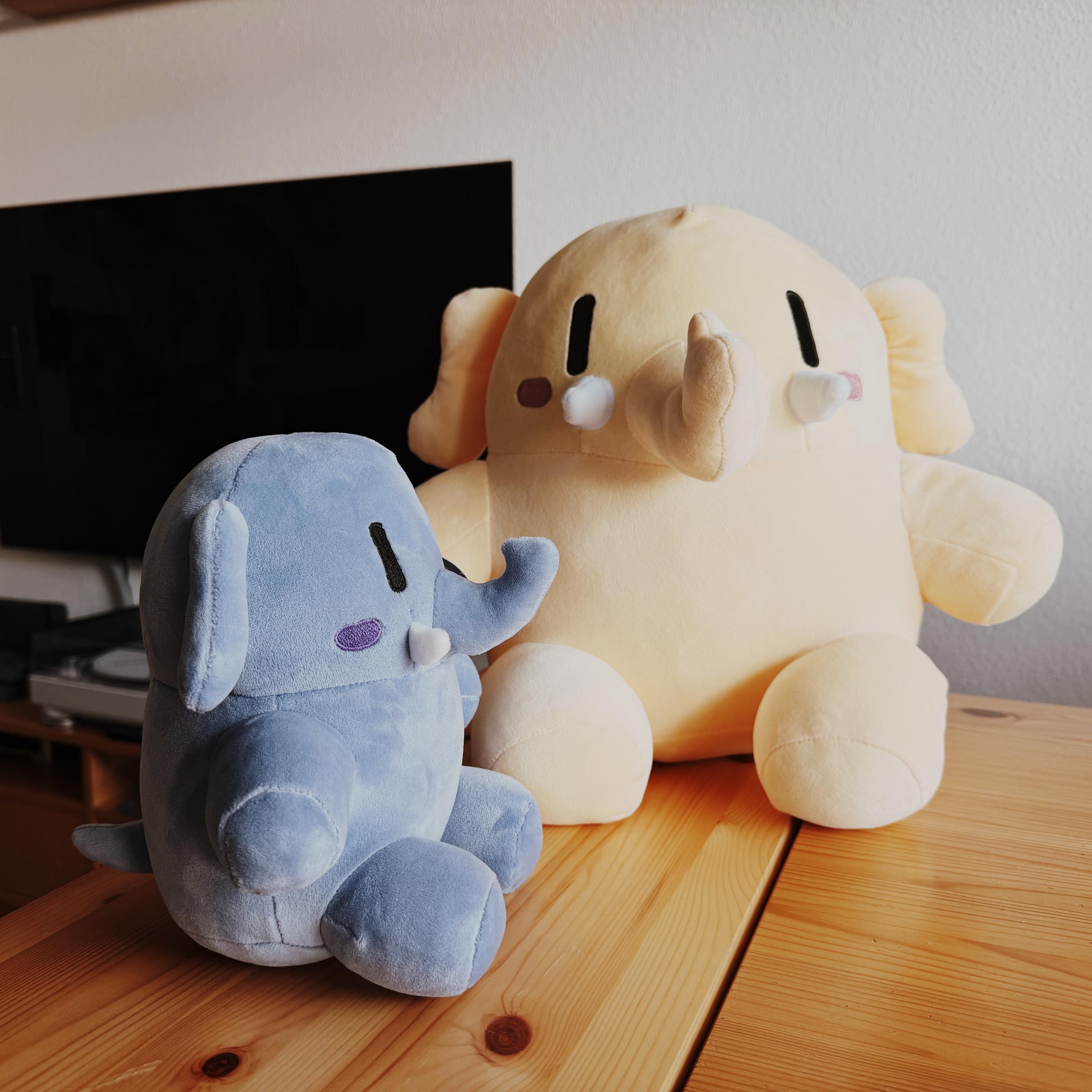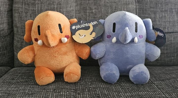 Two plushtodons enjoying their oat caramel lattes. (Yes, they do use their trunks to sip.)
