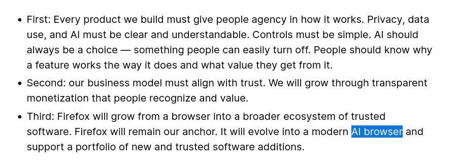 Some thoughts on Mozilla's trajectory and Waterfox's stance on AI in the browser 👇