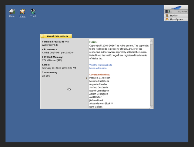 Hi there, I have start to work on an arm64 port for Haiku and the end goal is full RPI5 support. It will be interesting to see how far we can go.So far I got a minimal arm64 desktop image working in qemu: A screenshot from qemu.Haiku Community