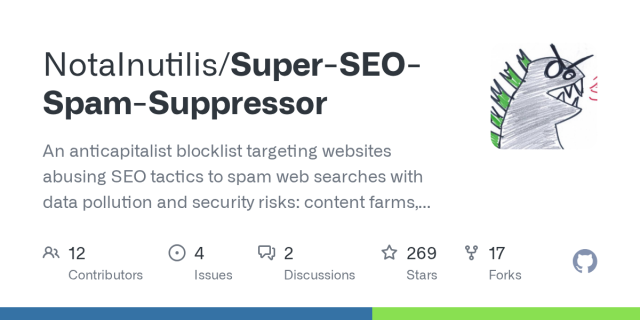 in reply to Fionnáin • • •GitHub - NotaInutilis/Super-SEO-Spam-Suppressor: An anticapitalist blocklist targeting websites abusing SEO tactics to spam web searches with data pollution and security risks: content farms, scrapers, copycats, generative AIs, scams, advertisements, malw