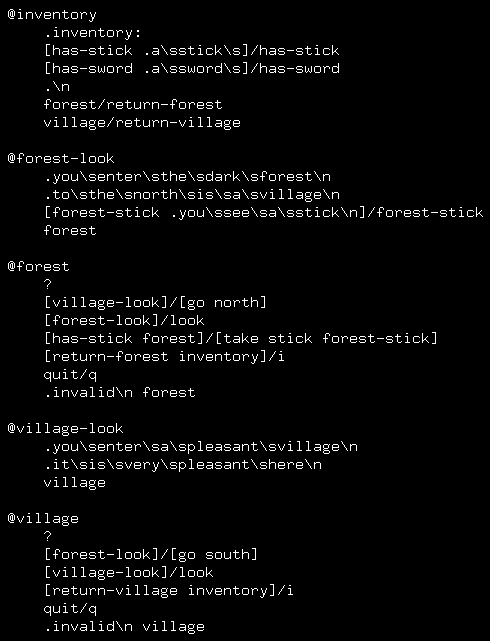 hehehe, a text-based adventure game is theoretically possible. I added a naive "?" command to get a line of input (its then split into words, and those words are put into the bag)