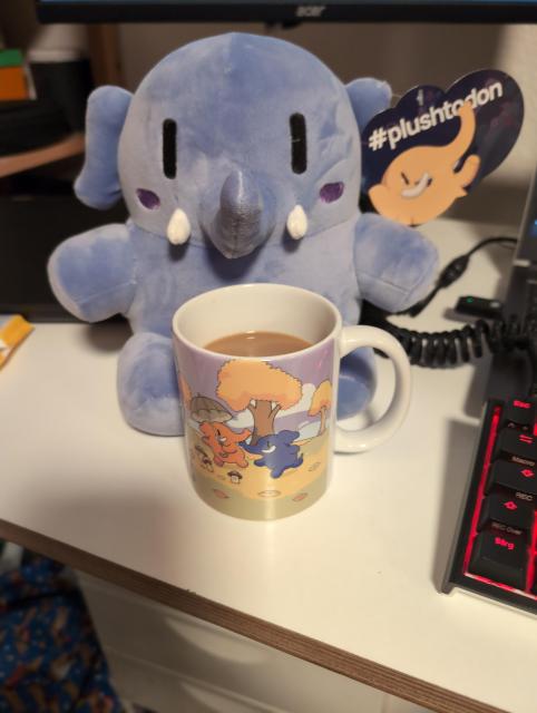 Joy Mastodon, resplendent in her garden today, sends best wishes to all her fellow #plushtodon souls.