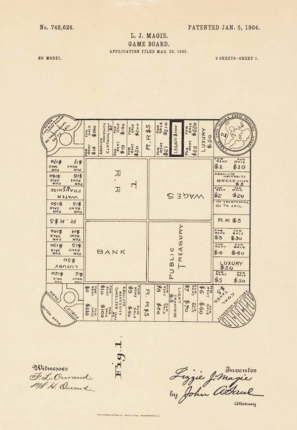 Magie was friends of the Parker brothers and I believe they even published her game. They made recommendations to her, such as patenting it as a game, she patented it as a learning device. Her game was tied to the ideas of Henry George and 100% tax on property.