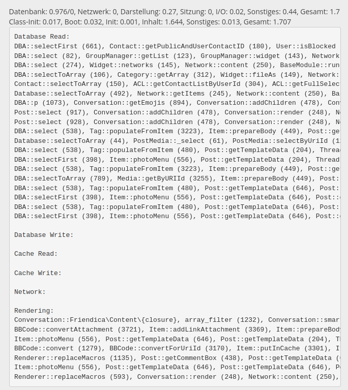 Post::select (216), Conversations::content (93), Index::content (250), BaseModule::run (711): 14.44Do you have an idea what to do next?