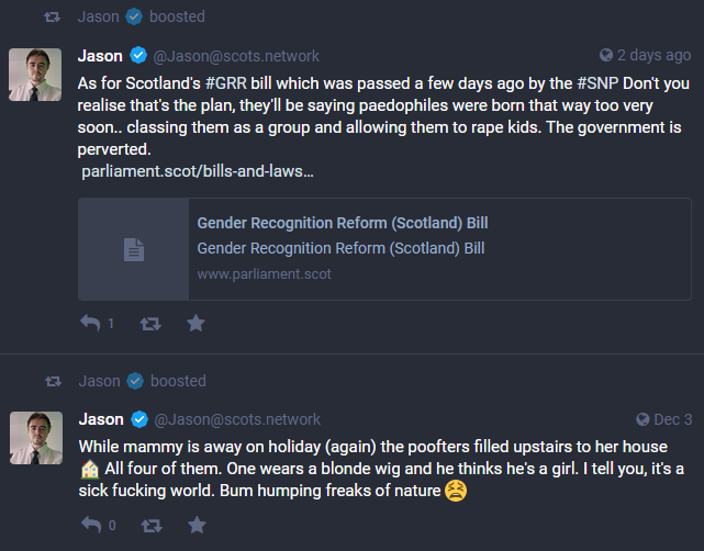 Says he will not allow "queers" on his instance. Federates with hate speech, anti-LGBT instances. See below screenshots for more information.