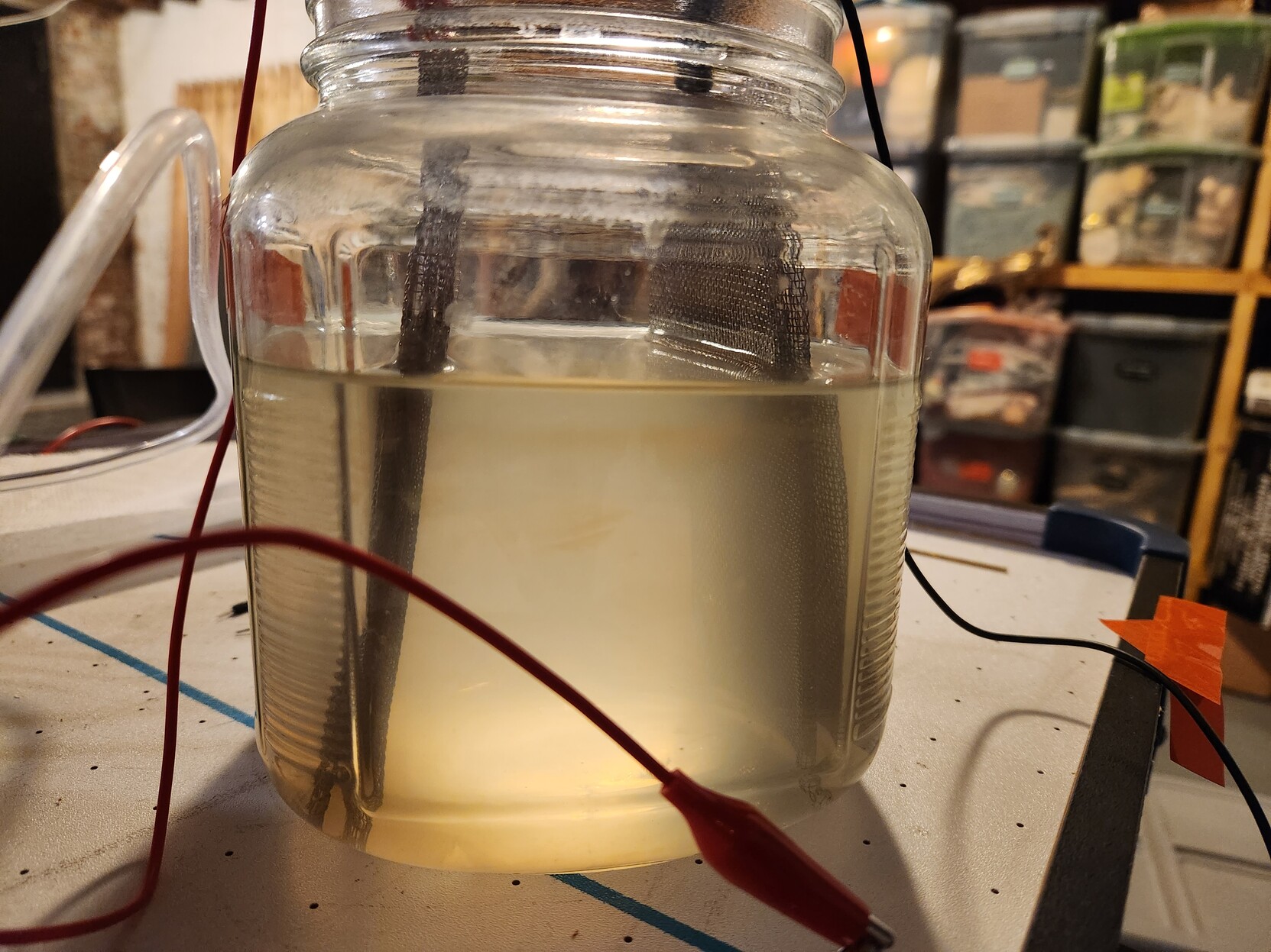 I'm using 1V DC in a jar of fresh water with 304 stainless steel mesh electrodes, a small pinch of salt, and a small pinch of yeast extract. No aeration.