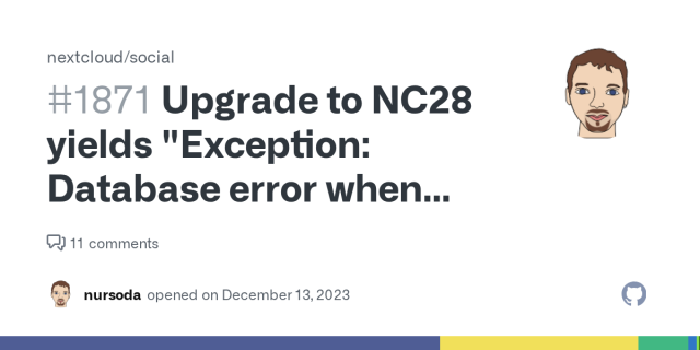 Upgrade to NC28 yields "Exception: Database error when running migrationβ¦" Β· Issue #1871 Β· nextcloud/social