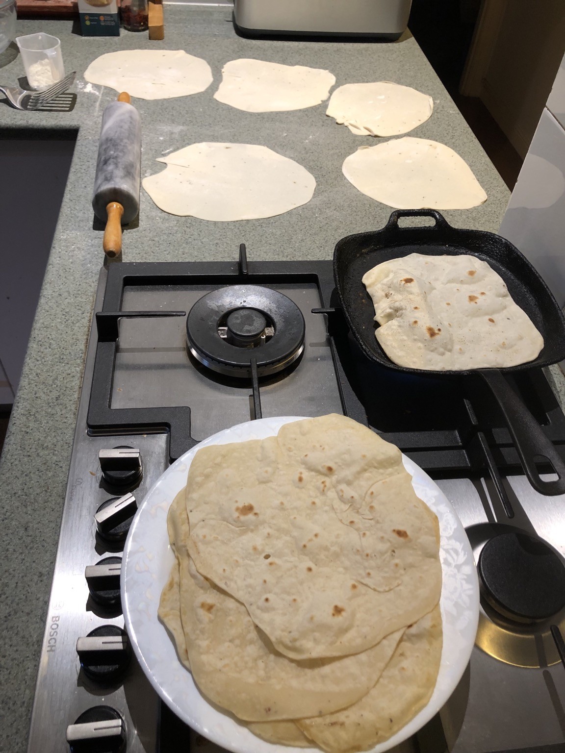 I then make the dough, knead it, cut and roll out. By then the pan is good and hot, and off I go. 😀