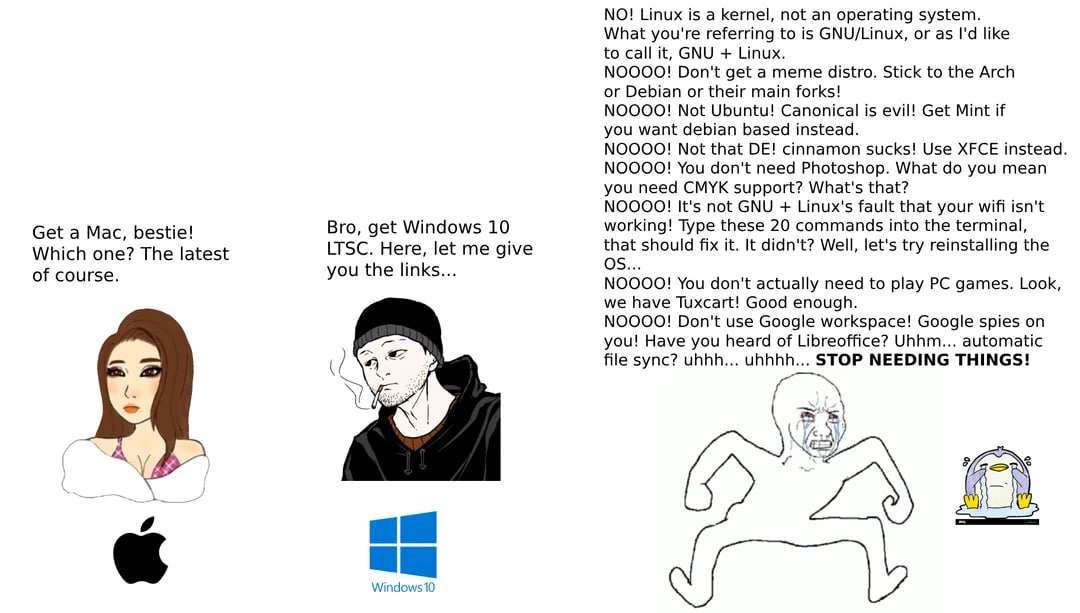 No. Linux users are also one of the yelling guys, but they're yelling at other Linux users over dumb shit like package managers, text editors, and desktop options.