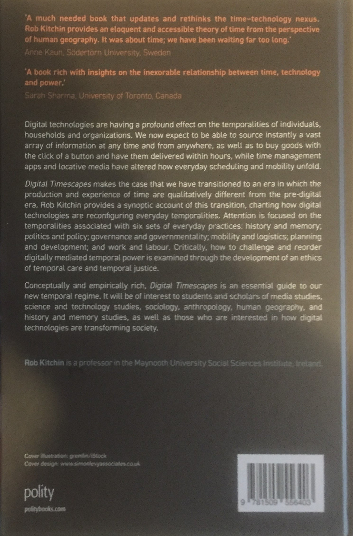 'Digital Timescapes: Technology, Temporality & Society' published by Polity Books just arrived in post. Covers how the digital reconfigures time w/ respect to history/memory, politics/policy, governance, mobility/logistics, planning/dev, & work/labour. In my mind, 4th book in a set of Mapping Cyberspace, Code/Space, The Data Revolution, Digital Timescapes that plots spatial & temporal implications of digital infrastructure, software & data.