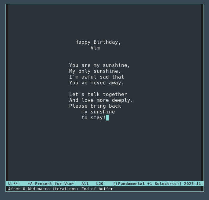 Wow, vim was less than a third its current age when I started using it. And now my fingers canβt use any other editor and I am locked in far more comprehensively than any monopolist could ever dream of doing with their most obnoxious anticompetitive behaviour.