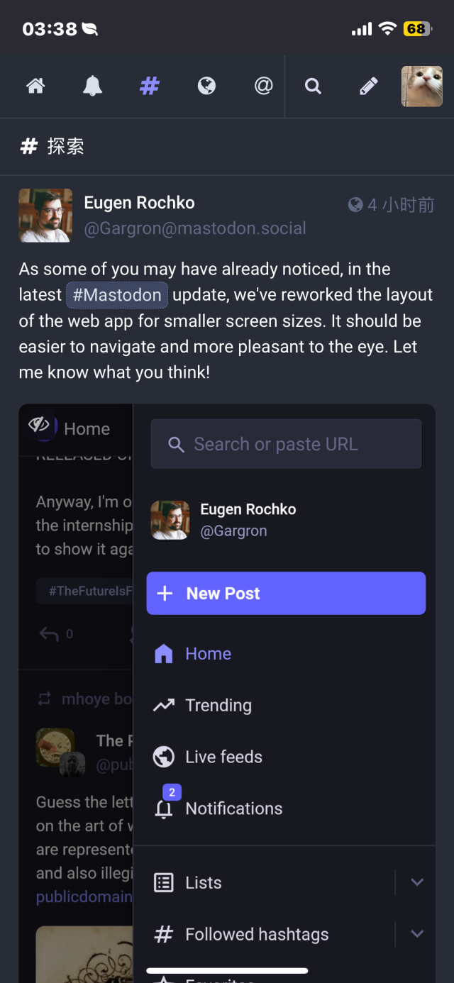 in reply to Eugen Rochko • • •Menu bar at side gone - great!