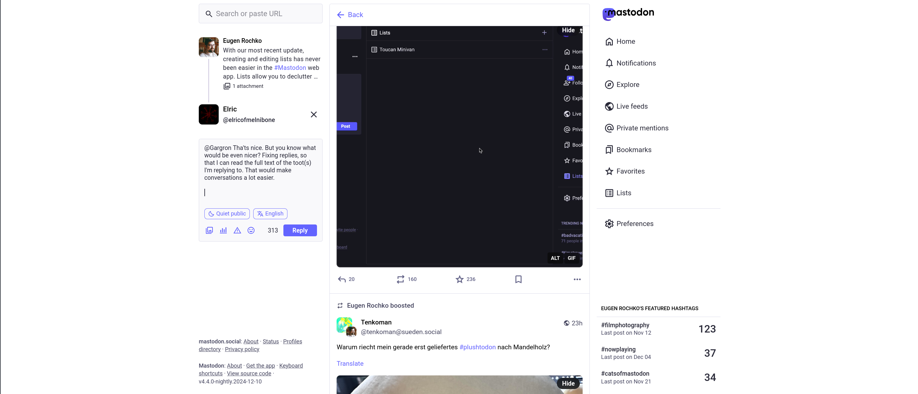 in reply to Eugen Rochko • • •nice addition, lists seem like a really useful feature to keep track of certain subjects, (groups of) people, and so forth! definitely would make more sense of the clutter.