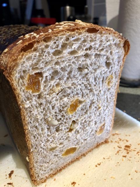 Rise - 2-4hrs Form in to a rectangle, 1cm thick arrange dried fruit and nuts of your choice over the entire rectangle. Roll up and place in a greased bread tin. Pre-heat oven to 220ΒΊC. When risen, put bread in oven, spray oven with water and decrease to 185ΒΊC. Bake 44min.